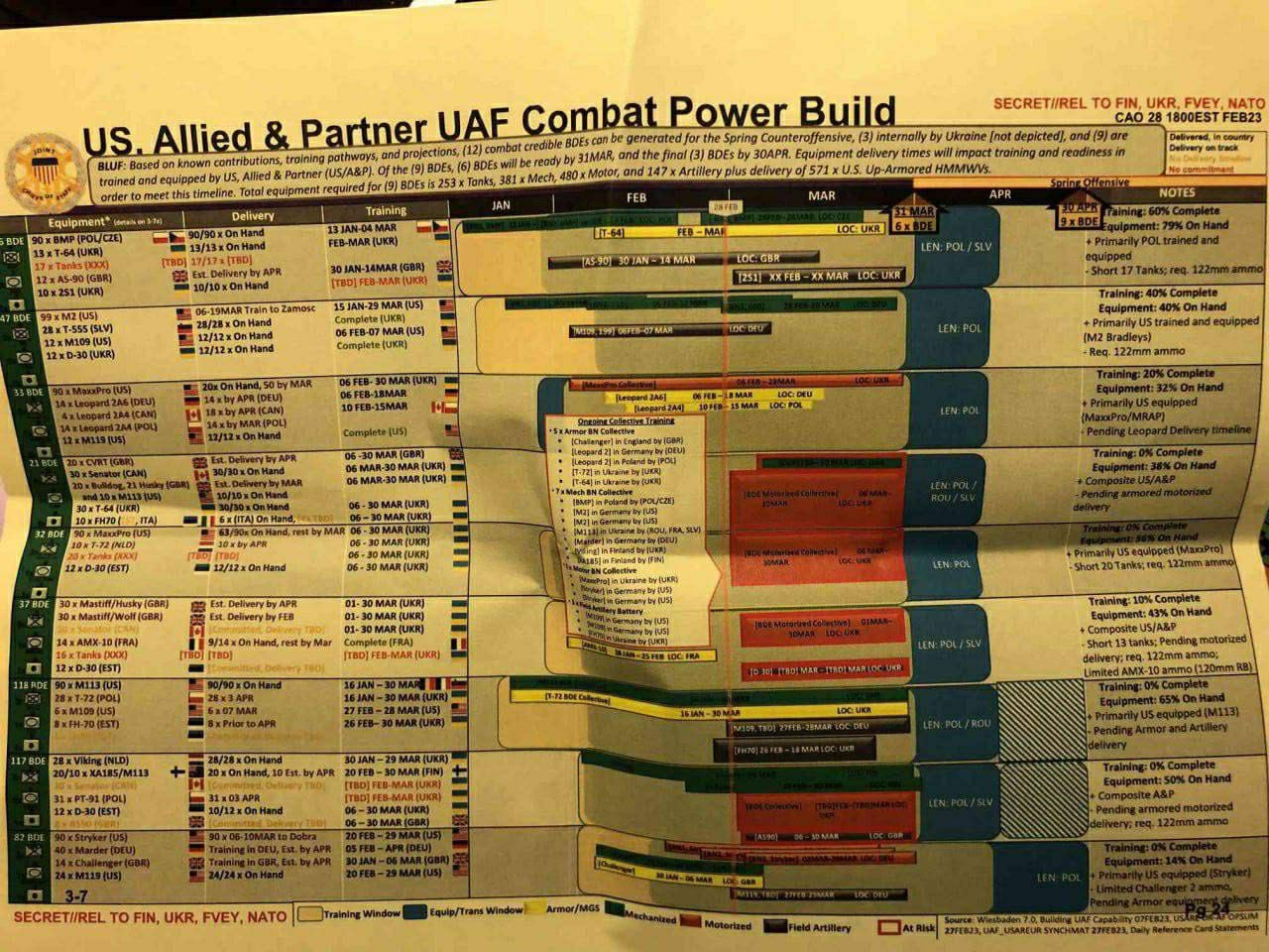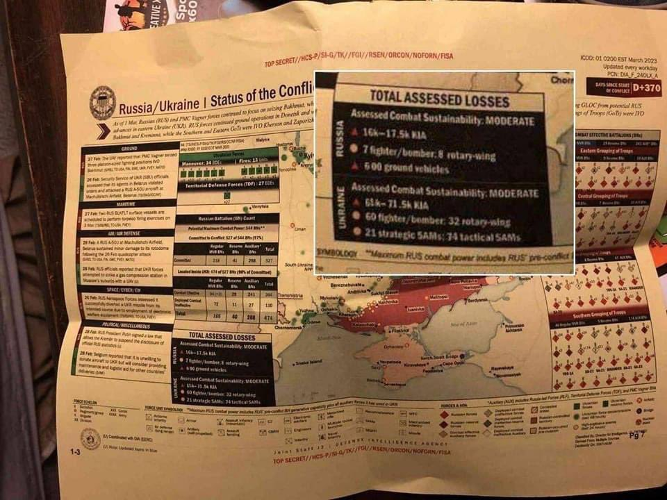 近日Twitter以及Telegram上出現一批外流機密文件,內容包含了烏克蘭春季攻勢的完整計畫以及美國國安重要訊息,在外洩資料中詳細列出了北約各國應該提供給予烏克蘭進行春季攻勢的裝備、協助訓練九個使用北約制式武器的旅級單位以及春季攻勢預定時辰,根據時間表,北約與烏克蘭應該在三月前完成所有準備,並在四月初發動攻勢,但目前這場攻勢還未開始,烏克蘭在部隊的整備上也尚未完善。